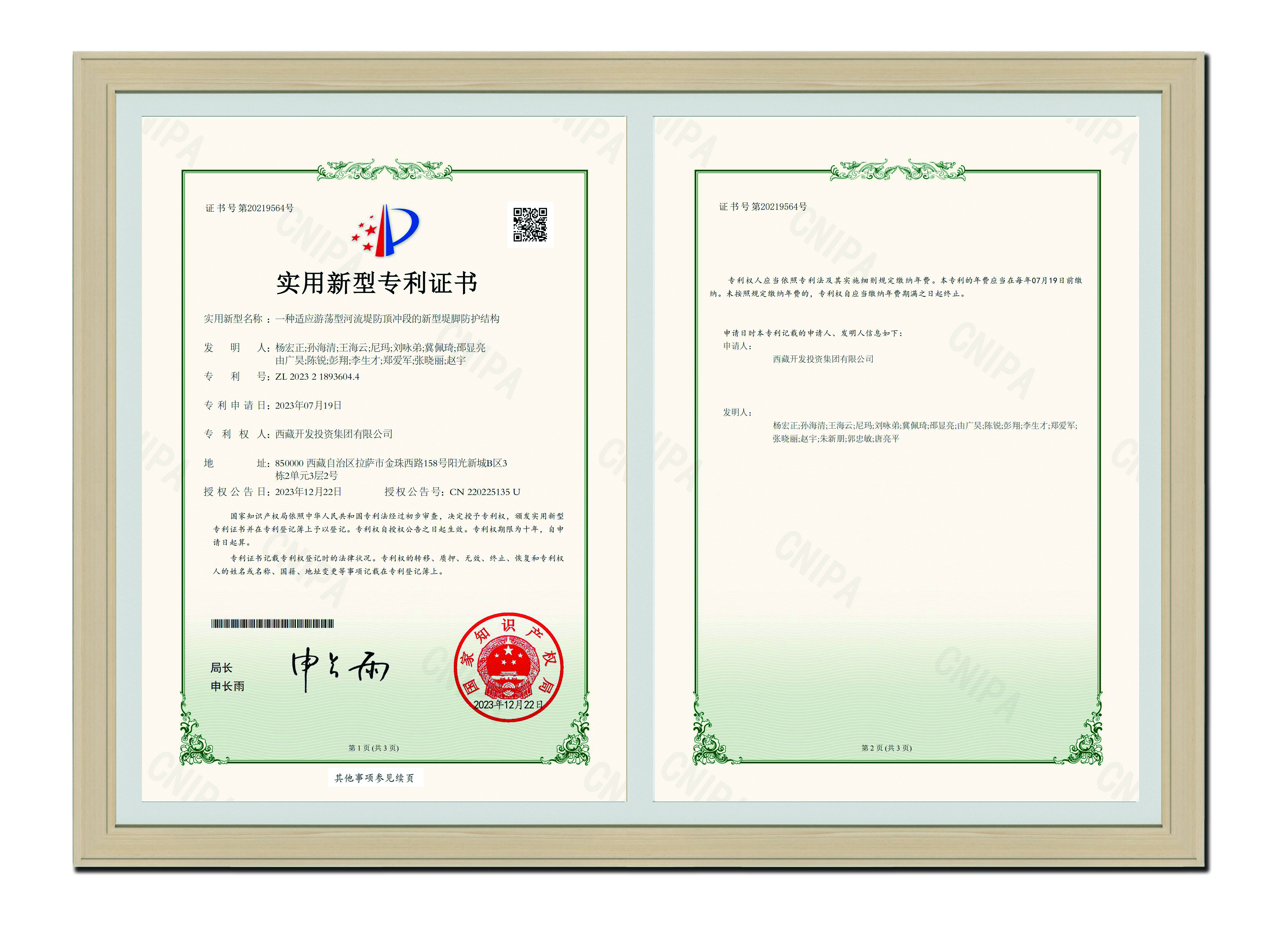 2023年12月22日 一種適應(yīng)游蕩型河流堤防頂沖段的新型堤腳防護(hù)結(jié)構(gòu)-實(shí)用新型專利證書