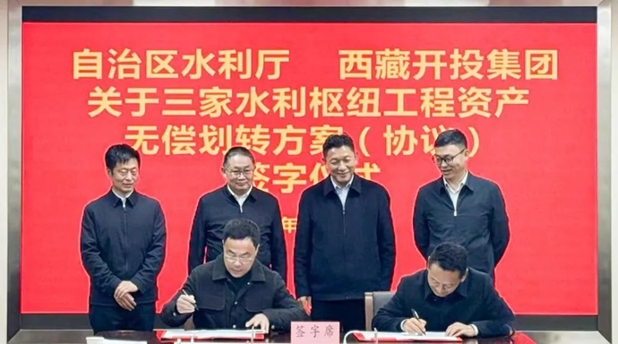 12月11日,自治區(qū)水利廳與西藏開投集團在拉薩簽署旁多、滿拉、拉洛三大水利樞紐工程資產(chǎn)無償劃轉(zhuǎn)協(xié)議,標志著西藏國有企業(yè)改革邁出堅實步伐。自治區(qū)水利廳黨組副書記、廳長和忠華,區(qū)政府國資委黨委委員、副主任于雷,西藏開投集團黨委書記、董事長祁騰武出席簽字儀式并講話。自治區(qū)水利廳黨組成員、副廳長趙輝與西藏開投集團黨委委員、副總經(jīng)理尼瑪代表雙方簽署協(xié)議。集團領(lǐng)導羅布次仁、陳焱罡出席儀式。