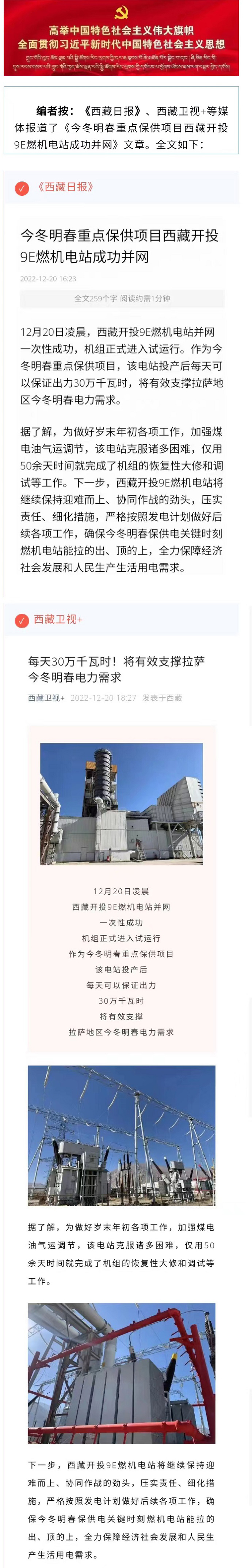 《西藏日報》、西藏衛(wèi)視+報道今冬明春重點(diǎn)保供項(xiàng)目西藏開投9E燃機(jī)電站成功并網(wǎng)