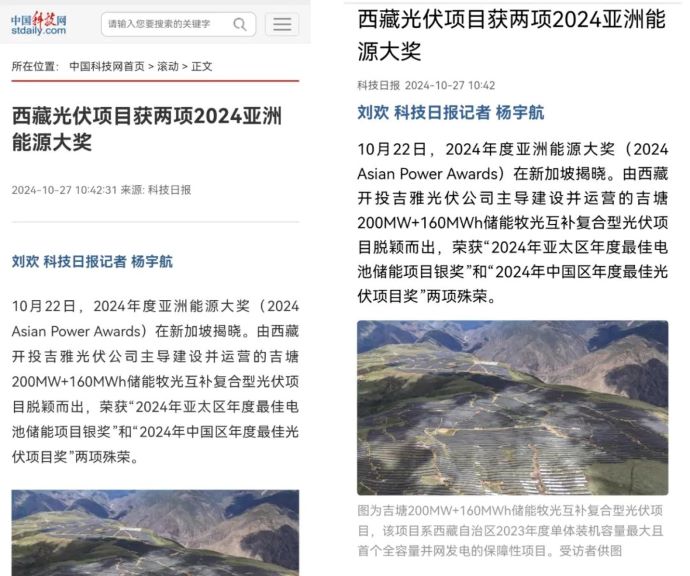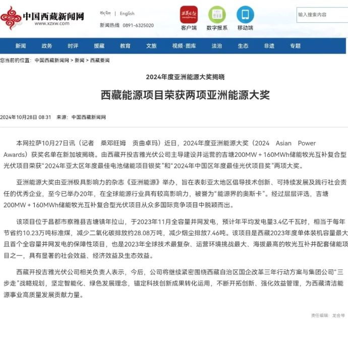編者按:近日,中國科技網(wǎng)、科技日報、西藏日報、西藏發(fā)布、中國西藏新聞網(wǎng)、西藏商報、昌都發(fā)布等多家媒體集中宣傳報道了西藏開投吉雅光伏公司榮獲兩項亞洲能源大獎相關(guān)事宜。摘要如下: