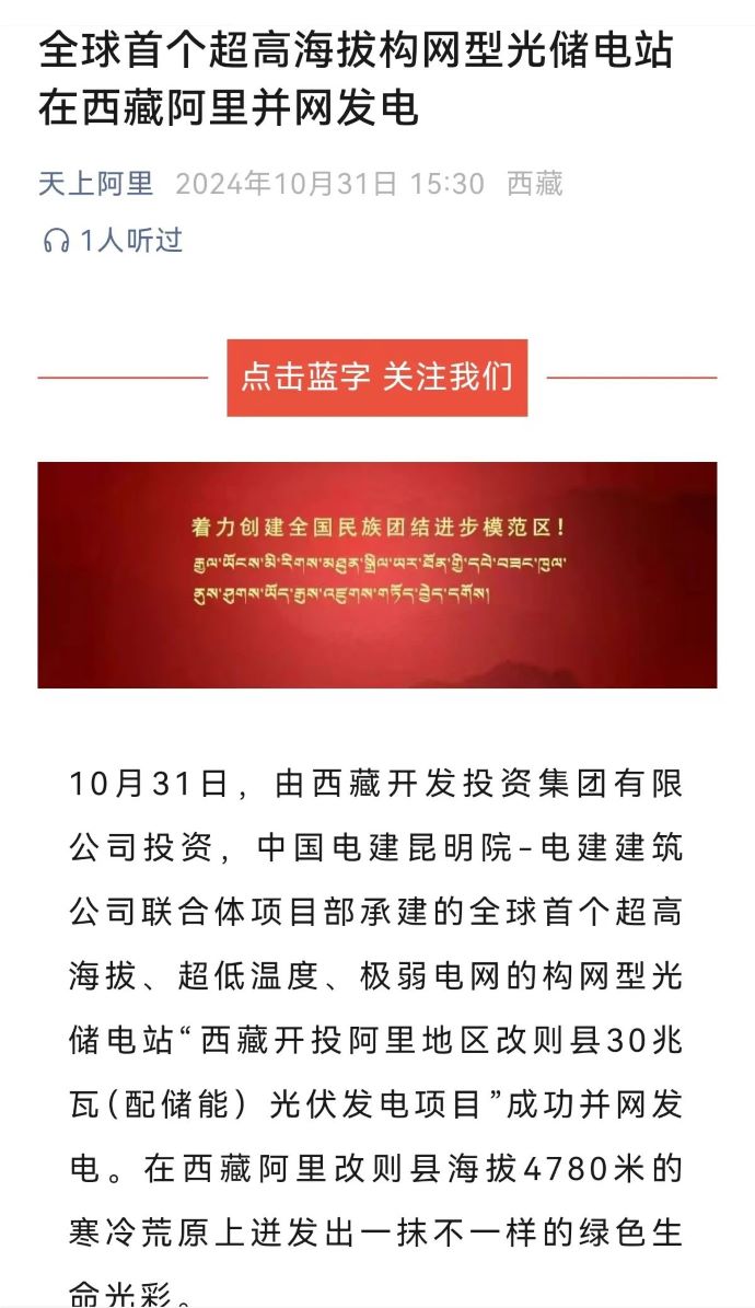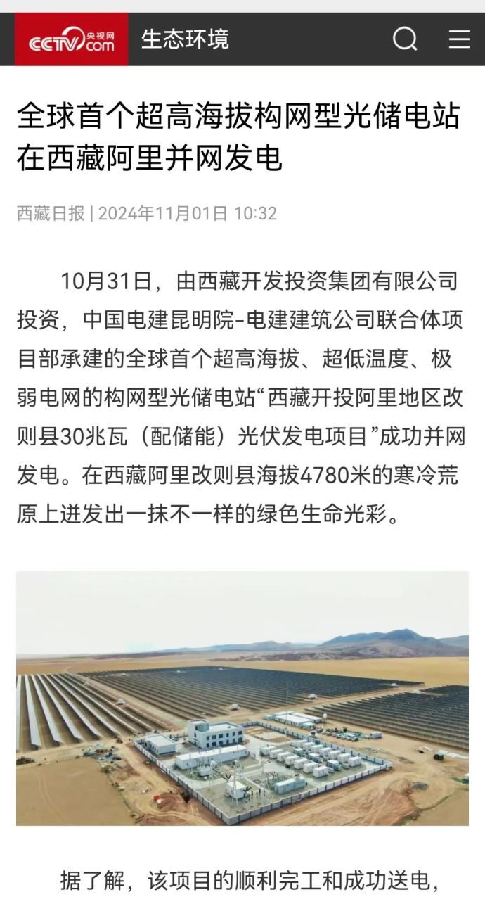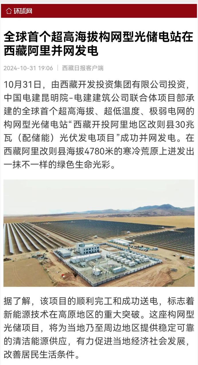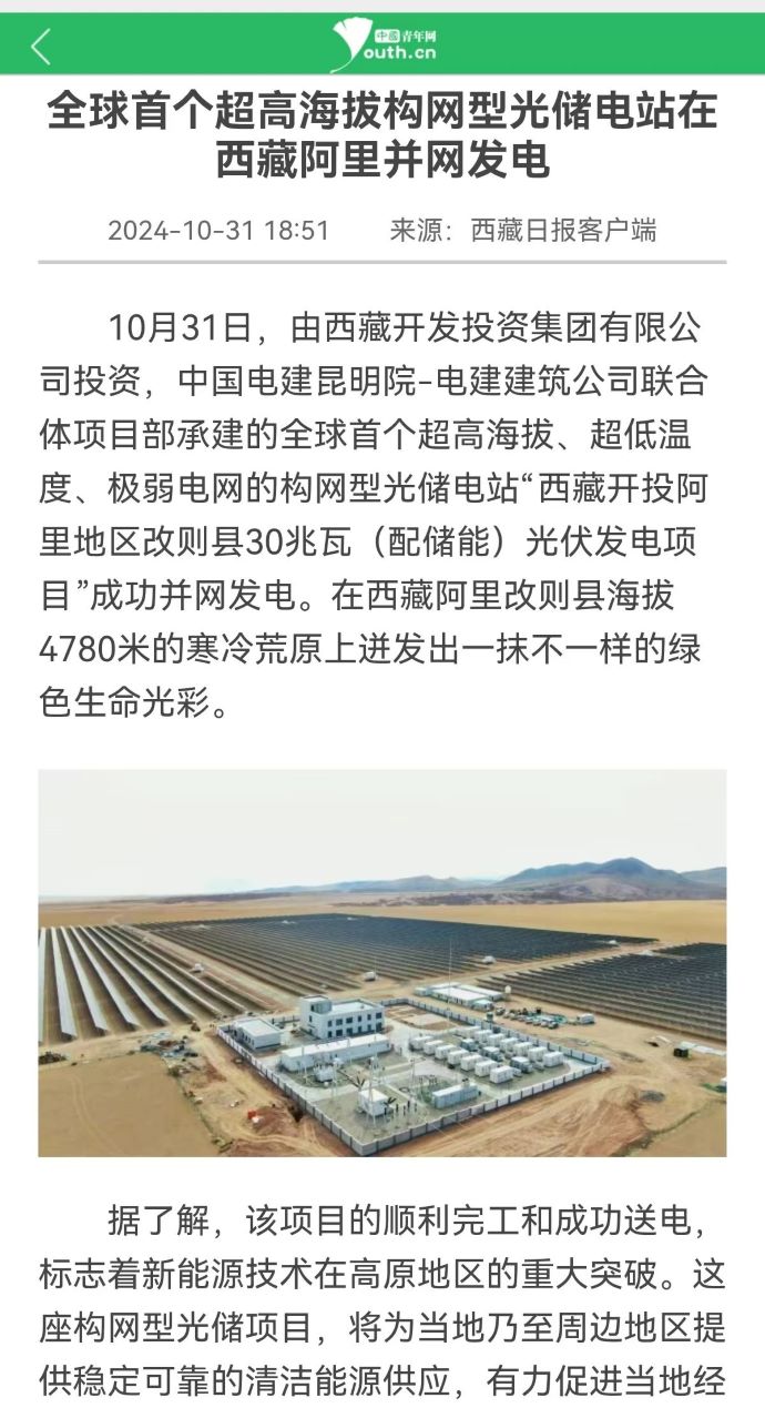 10月31日,由西藏開投集團(tuán)投資、中國(guó)電建昆明院-電建建筑公司聯(lián)合體項(xiàng)目部承建的,全球首個(gè)超高海拔、超低溫度、極弱電網(wǎng)智能組串式構(gòu)網(wǎng)型光儲(chǔ)電站——西藏開投阿里地區(qū)改則縣30兆瓦(配儲(chǔ)能)光伏發(fā)電項(xiàng)目,成功并網(wǎng)發(fā)電,標(biāo)志著新能源技術(shù)在高原地區(qū)的重大突破。