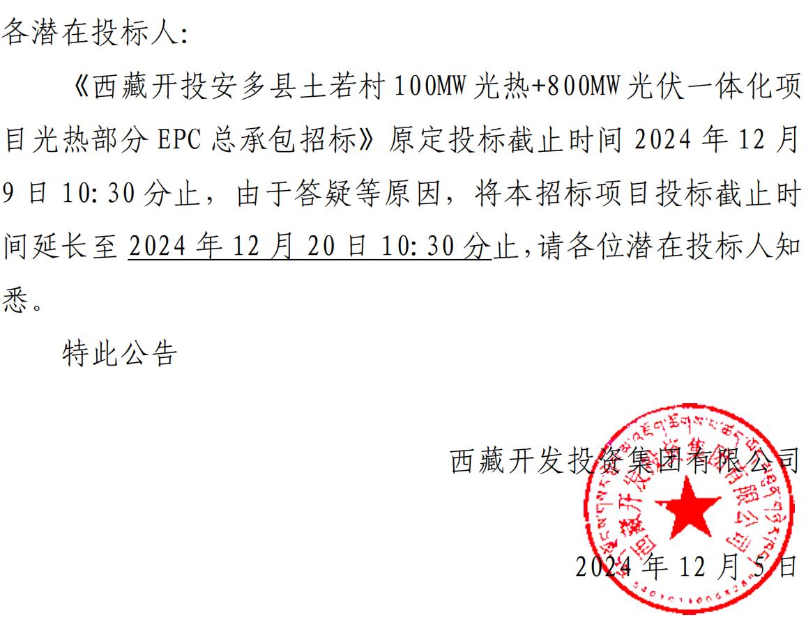 關(guān)于延長《西藏開投安多縣土碩 100MW 光熱+800MW 光伏一體化項目光熱部分 EPC 總承包招標(biāo)》投標(biāo)截止時間的公告
