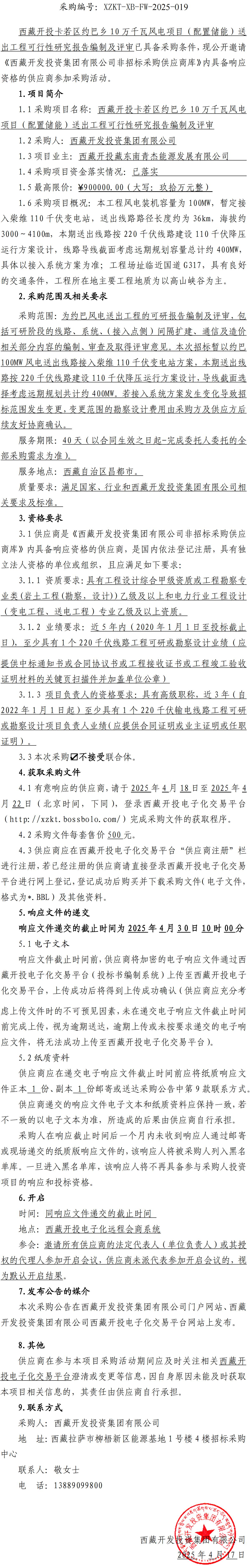 西藏開投卡若區(qū)約巴鄉(xiāng)10萬千瓦風(fēng)電項目(配置儲能)送出工程可行性研究報告編制及評審詢比采購公告