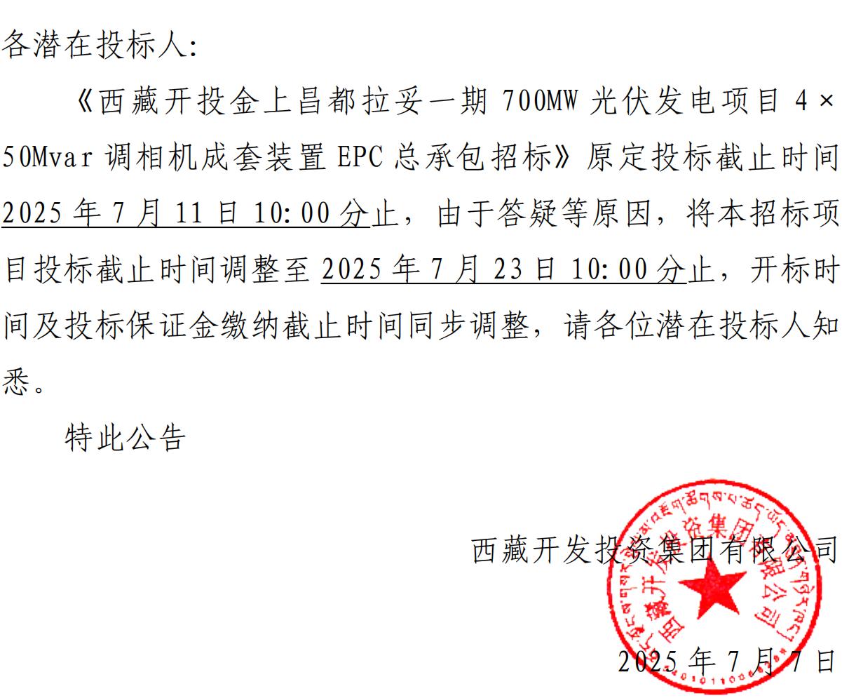 關于延長《西藏開投金上昌都拉妥一期700MW光伏發(fā)電項目4×50Mvar調相機成套裝置EPC總承包招標》投標截止時間的公告