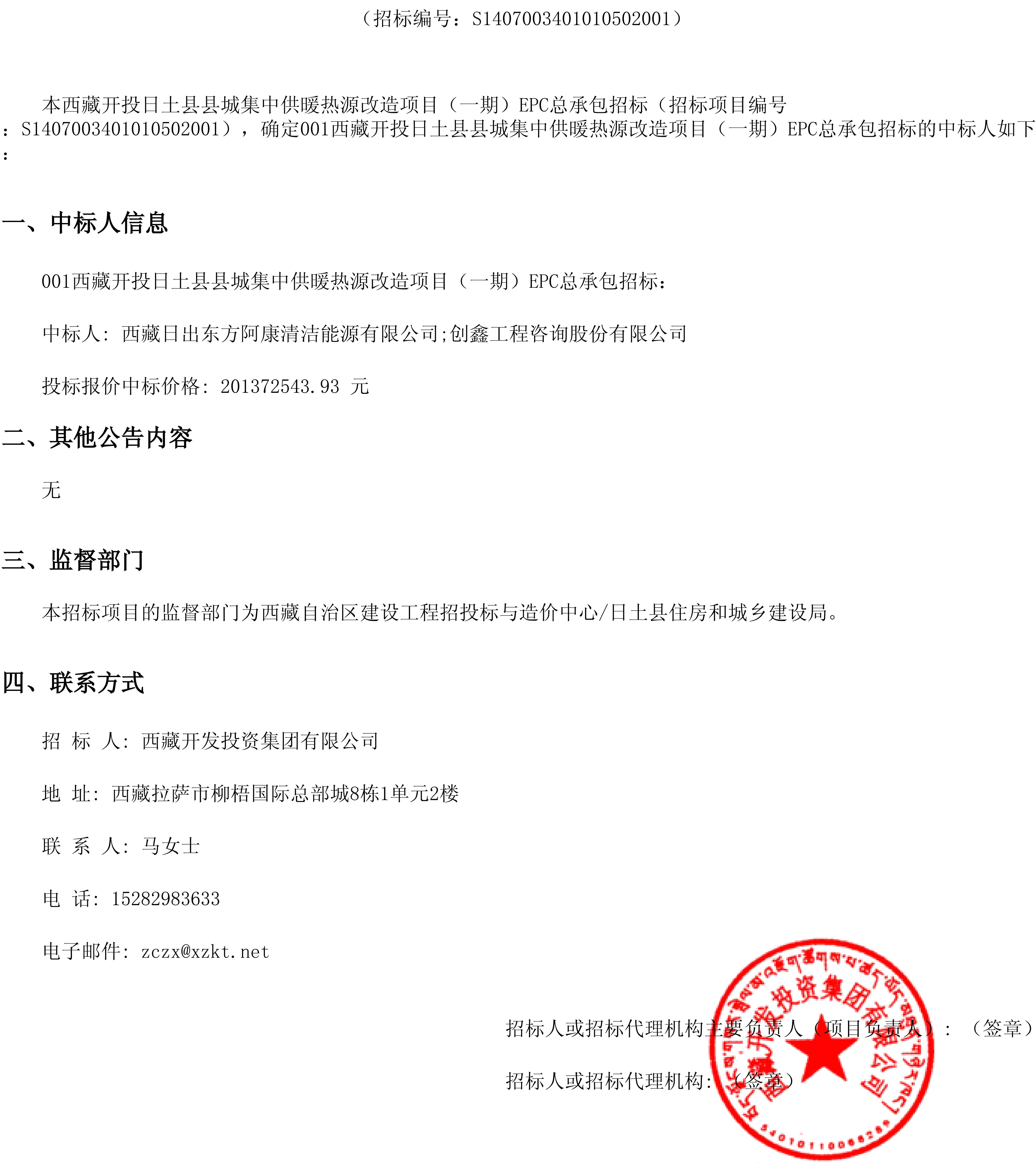 西藏開投日土縣縣城集中供暖熱源改造項目(一期)EPC總承包招標項目中標結(jié)果公告